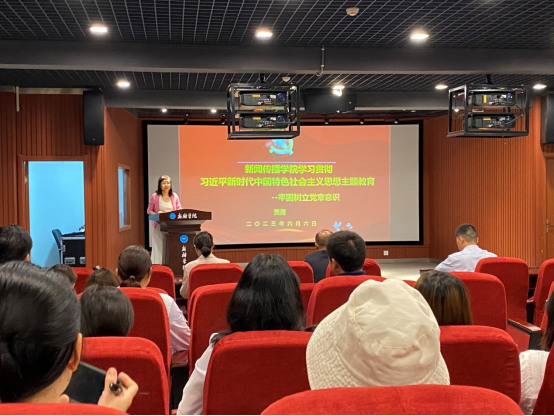为深入推进学习贯彻习近平新时代中国特色社会主义思想主题教育走深走实,引导党员牢固树立党章意识,自觉做党章的坚定执行者和忠实捍卫者,6月6日下午,tyc234cc太阳成集团党委在A12五楼审片室开展主题教育系列专题党课,党委副书记贾菁以“牢固树立党章意识”为题,为tyc234cc太阳成集团全体教职工讲授了一堂生动的党课。