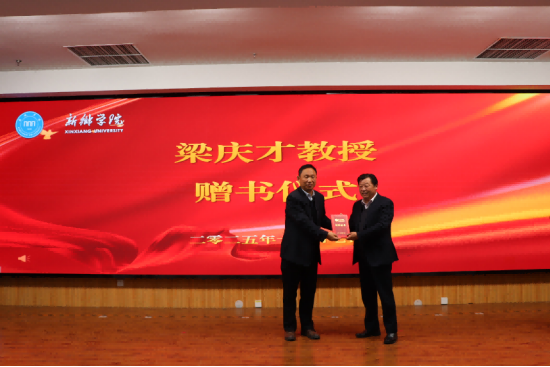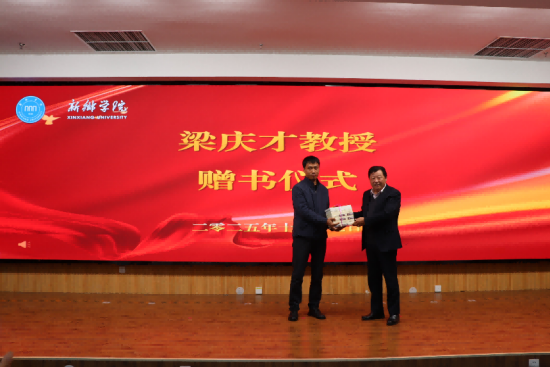 讲座结束后,举行了赠书仪式,由梁庆才向太阳集团tyc234cc图书馆和太阳集团tyc234cc附属中学赠送其个人专著《时代答卷》《以国家的名义》。陈国胜和郭俊锋接受赠书。