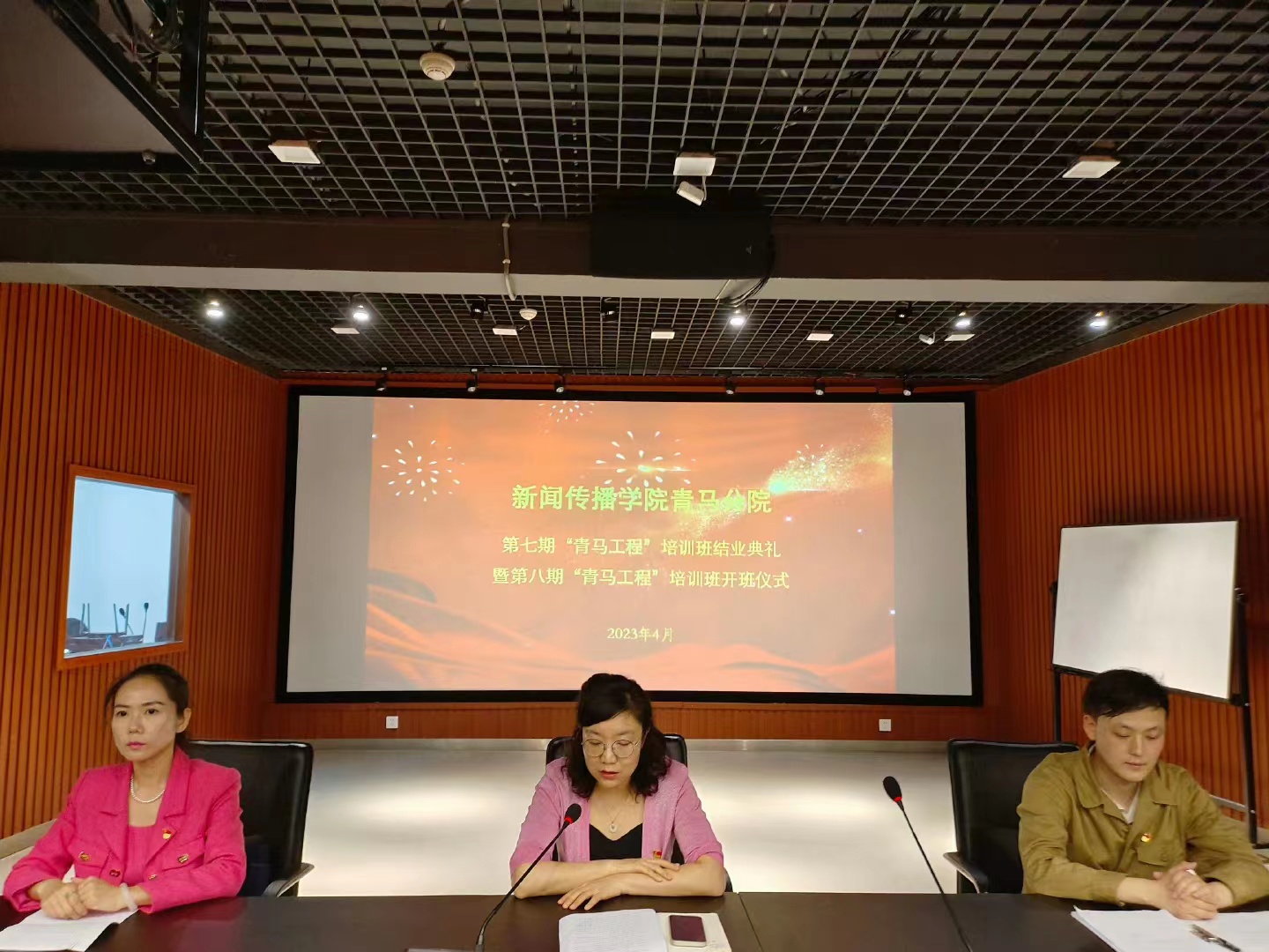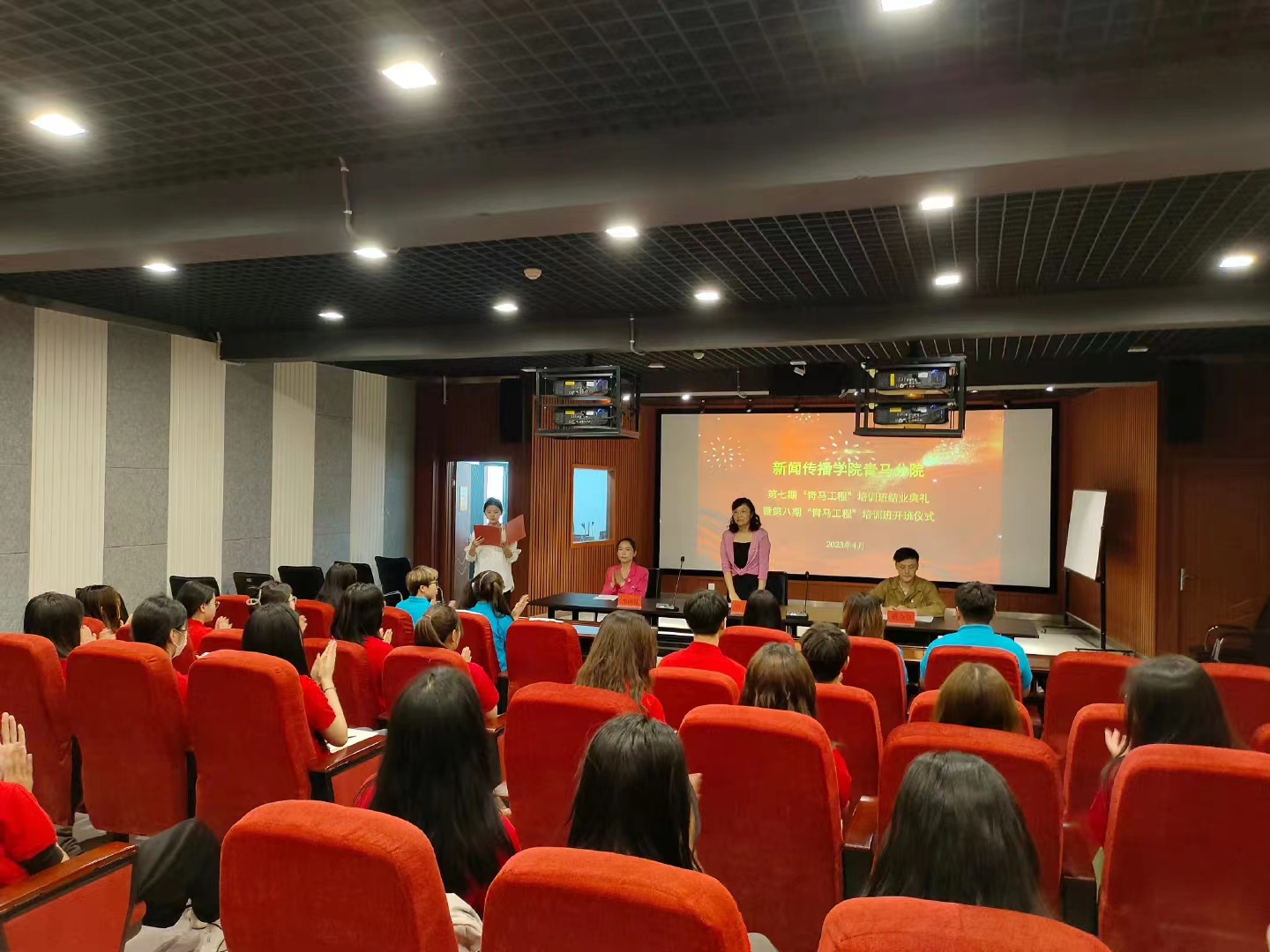 2023年4月18日下午三点,tyc234cc太阳成集团于A12审片室举行第七期 “青马工程”培训班结业典礼暨第八期“青马工程”培训班开班仪式。tyc234cc太阳成集团党委副书记贾菁、tyc234cc太阳成集团学工办主任李彦霓、tyc234cc太阳成集团老师游令昆,第八期青马班全体学员以及第七期青马班学生代表出席此次仪式,由tyc234cc太阳成集团团委副书记段蓓蓓主持。