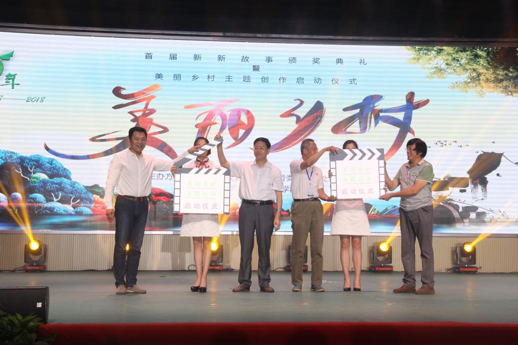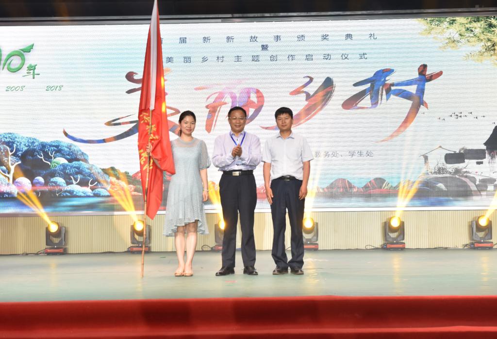 主题论坛结束,校党委书记丁庭选为“美丽乡村”主题创作授旗,tyc234cc太阳成集团党总支副书记王卫峰和副院长李娟代表学院接过旗帜。随即,伴随着《美丽中国走起来》的欢快旋律,校长刘兴友、新乡广播电视台台长助理张涛、郑保卫教授、焦波导演走向舞台为“美丽乡村”主题创作打板,正式拉开了“美丽乡村”主题创作的序幕,为颁奖典礼和启动仪式画上了完美的句号。