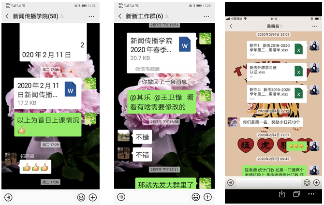 新传学院迅速行动,与有关部门密切沟通,全力以赴按照规定时间节点完成相关工作;全体任课教师夜以继日精心做好课堂设计、认真准备课程资源、主动学习掌握线上教学方法、提前与学生建立联系等,形成了学院、教研室与有关部门联动的良好局面。网络教学开学第一天,老师们在紧张新鲜有序的课程结束后,纷纷反馈自己的授课情况、学生到课情况、预期效果等,互相交流、互相建议、相互鼓劲。网络教学开课一周来,老师们把我们“应该做的、能够做的、通过努力能够做到”的事情争取做到最好、做到最佳,保持良好的、积极的心态,形成“不抱怨、不埋怨、稳中求进”的工作作风,新传学院涌现出一批克服重重困难,牢记教育使命,坚守工作岗位的先进群体与个人。