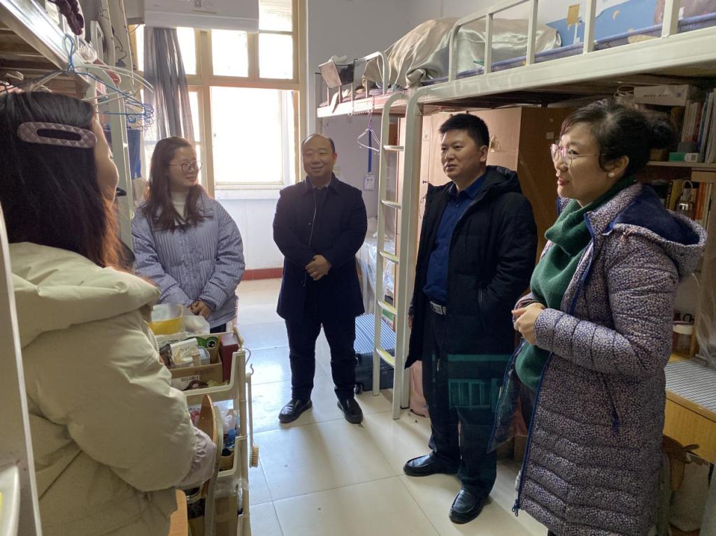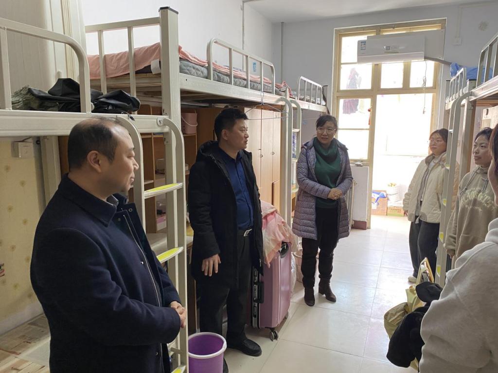 在校园东生活区E02、E03宿舍楼,学院领导一行走进学生宿舍,与同学们亲切交谈,深入了解同学们在家过春节的习俗、返校经历,近期的思想动态、生活状态和学习进展,关注同学们的困难和需求;体验了宿舍暖气片的温度,询问了宿舍空调的使用情况,特别强调宿舍水、电安全的重要性,提醒同学们要及时排查消防安全隐患,强化网络安全意识,确保校园生活的安全和舒适;并嘱托他们尽快调整到最优状态,保持良好的作息习惯,在新的学期里积极向上,刻苦学习,奋力拼搏,为实现自己的人生目标奠定坚实基础。