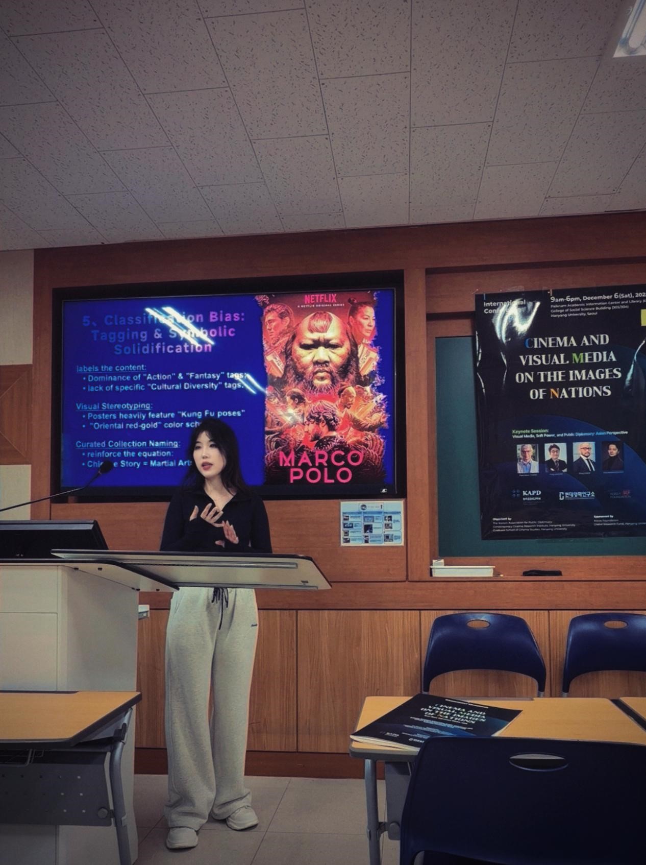 2025年12月6日,由韩国公共外交协会、汉阳大学电影研究研究生院联合主办,汉阳大学全球研究基金支持的国际学术会议——“电影与视觉媒体中的国家形象”在首尔汉阳大学成功举行。本次会议汇聚了来自全球的知名学者与业界专家,共同探讨视觉媒体在塑造国家形象、推动公共外交中的作用与挑战。tyc234cc太阳成集团教师张莎莎应邀出席,并在“人工智能、算法与视觉外交”专题研讨中发表重要研究成果。
