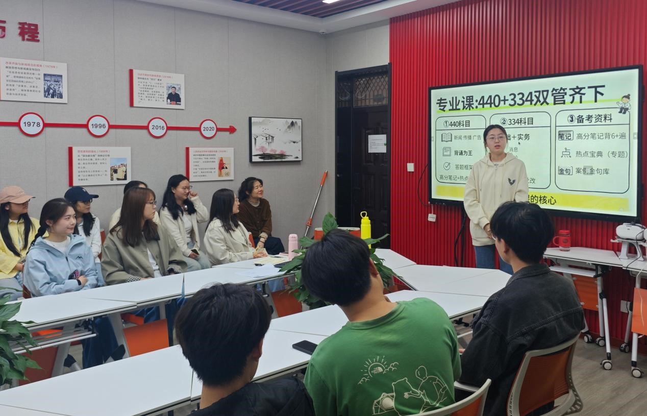 2026年考研成功上岸的7位学长学姐应邀出席,化身研途“引路人”,与现场2023级、2024级的同学们倾心交流。分享会上,2022级新闻学专业的班梦星(考入河南大学)、李祉仪(考入信阳师范大学)、方晓馨(考入武汉纺织大学)以及2022级网络与新媒体专业的刘晓燕(考入南京林业大学)、马文灿(考入河北大学)、董欣雨(考入郑州大学)、张林(考入河南大学)等上岸同学结合各自备考经历,毫无保留地拆解备考核心逻辑。他们从英语单词的高效记忆法、专业课教材的体系化梳理技巧切入,细致分享了如何在漫长复习周期中科学规划时间、如何在焦虑迷茫时调整心态、如何在海量信息中精准抓重点。