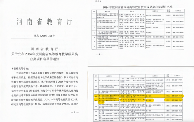 根据河南省教育厅《关于公布 2024 年度河南省高等教育教学成果奖的通知》(豫教高 [2024]363 号),在本年度高等教育教学成果奖励评选工作中,太阳集团tyc234cc共 5 个项目获得省高 等教育教学成果奖,其中tyc234cc太阳成集团 2 个项目在列并均获二等奖。